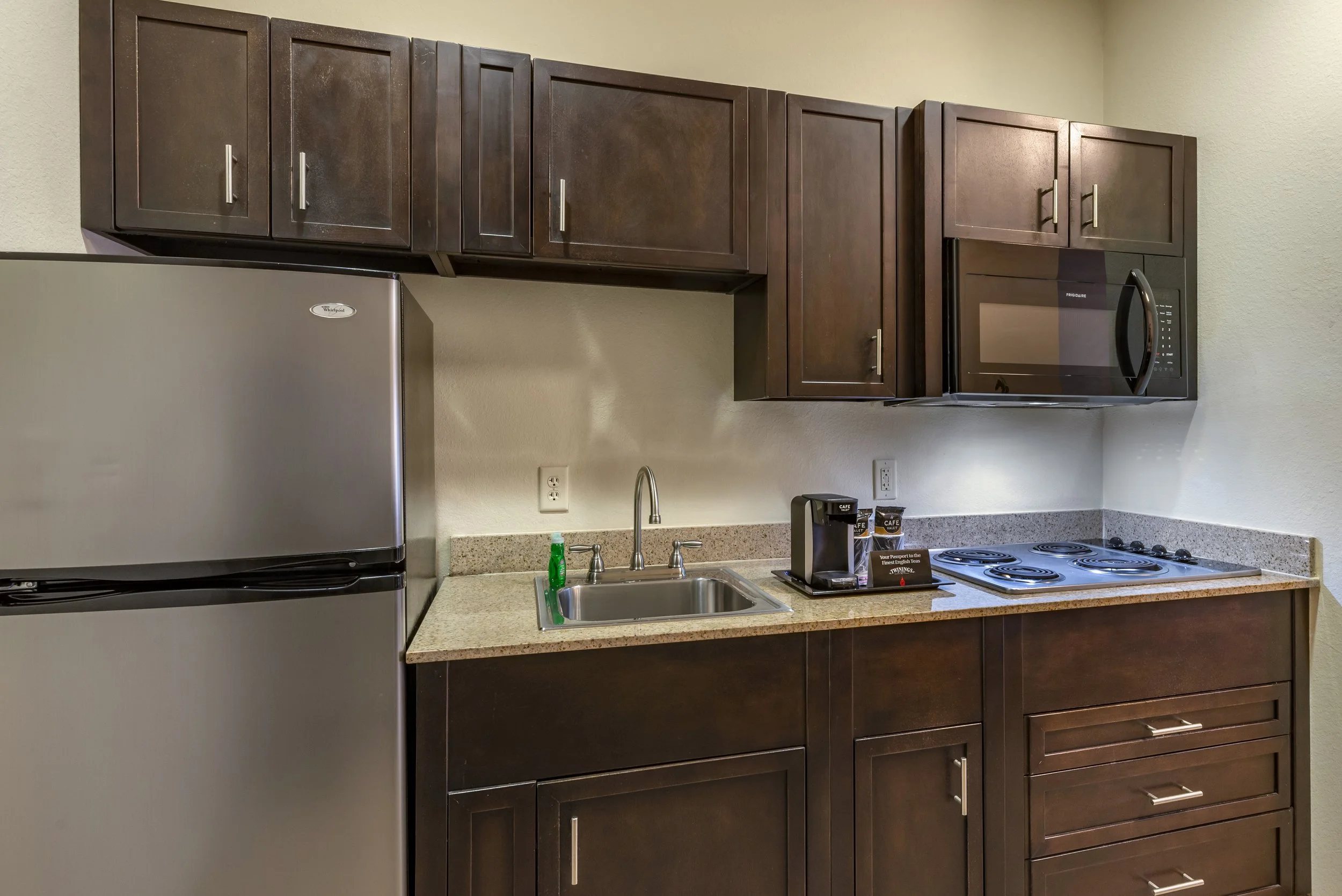 All suites feature a Queen or King Size bed, full kitchen with all essentials including pots, pans, 4-burner stovetop, microwave, refrigerator/freezer, dishes, glasses, coffee pot, toaster and much more.
